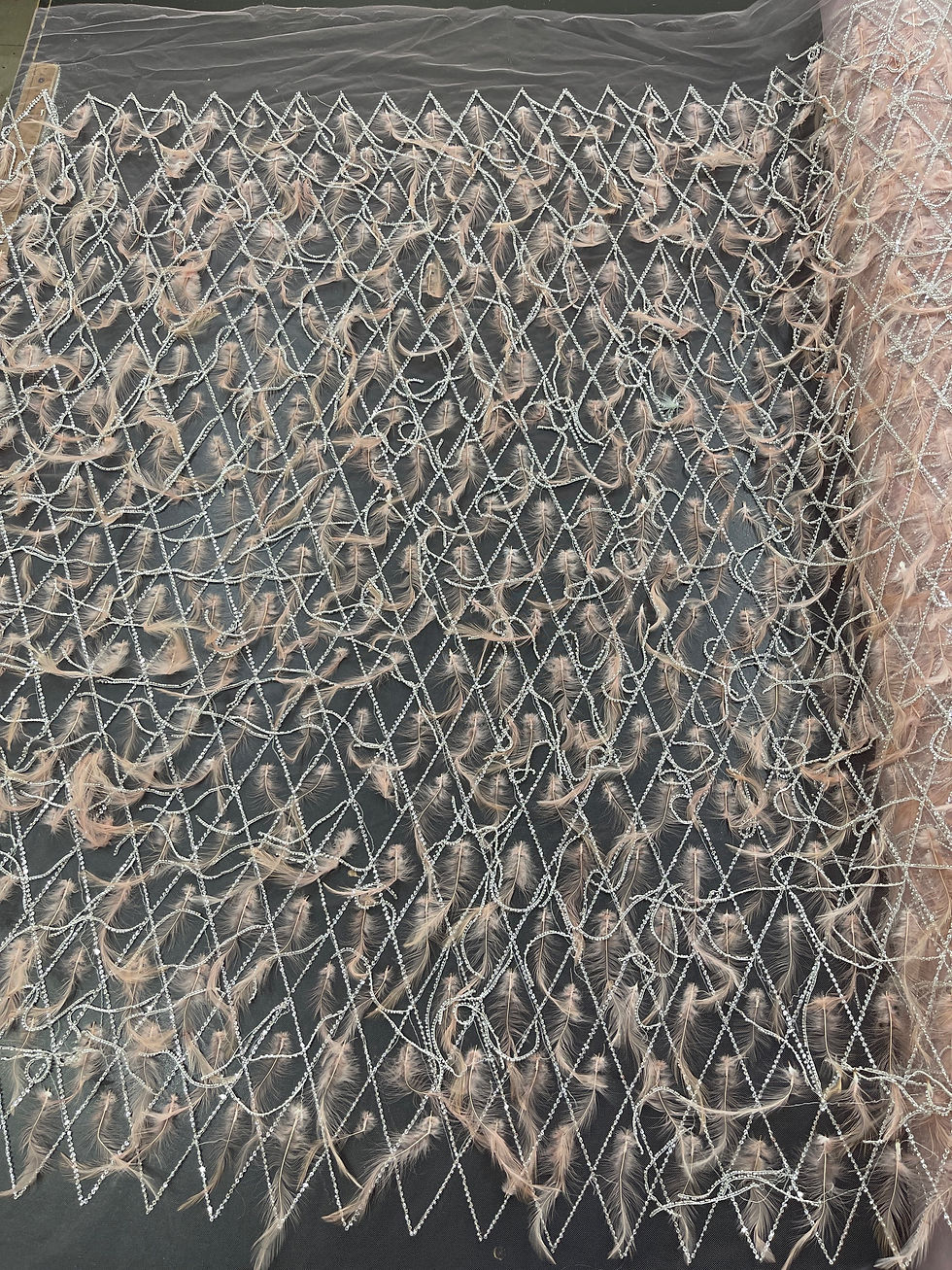 TUL BORDADO PERLAS Y PLUMAS PEACH